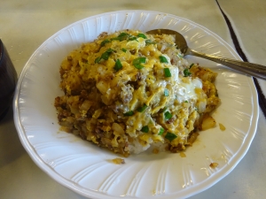 店によって少し特色があるようですが、野菜等を炒めて卵でとじたものをご飯の上に乗せる丼的なメニューになります。