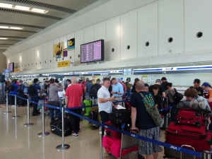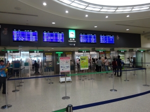 那覇空港のチェックインカウンターはなぜか国際線乗り継ぎの部分のみ非常に込み合っていました。